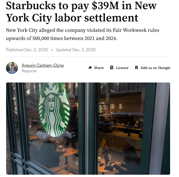 Starbucks recently paid nearly $39 million to settle Fair Workweek violations in New York City—the largest worker protection settlement in the city’s history. A Dunkin’ and Taco Bell franchisee paid over $1.5 million for similar violations.